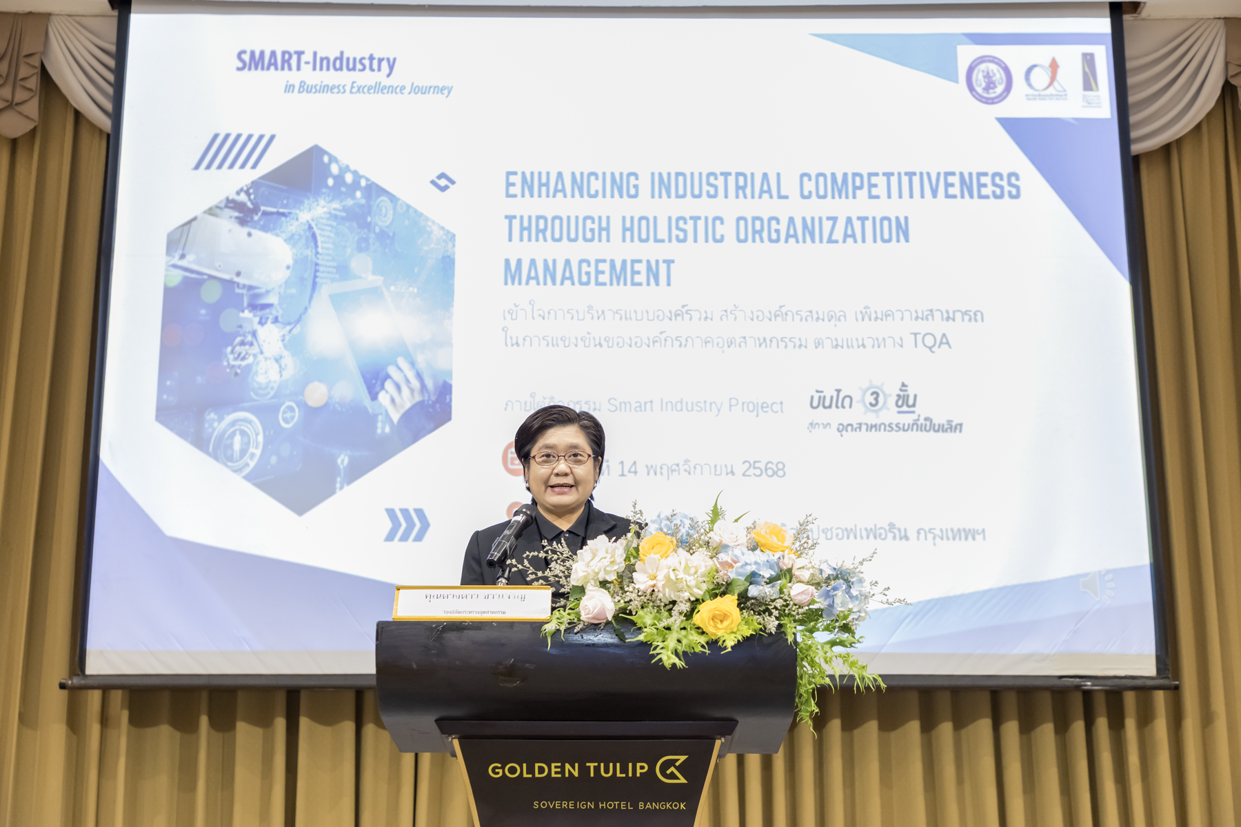 งานนี้ได้รับเกียรติจาก คุณดวงดาว ขาวเจริญ รองปลัดกระทรวงอุตสาหกรรม กล่าวเปิดงาน โดยเน้นถึงความสำคัญของการพัฒนาองค์กรอย่างเป็นระบบตามแนวทางเกณฑ์รางวัลคุณภาพแห่งชาติ (TQA) ซึ่งเป็นเครื่องมือสำคัญ ที่ช่วยให้องค์กรสามารถประเมิน วัดผล และพัฒนาศักยภาพอย่างครอบคลุมในทุกด้าน “การพัฒนาอย่างเป็นระบบตามแนวทาง TQA เป็นเครื่องมือสำคัญที่ใช้วัด และพัฒนาศักยภาพองค์กรอย่างรอบด้าน แนวทางดังกล่าวสอดคล้องกับเป้าหมายของแผนพัฒนาเศรษฐกิจและสังคมแห่งชาติ ฉบับที่ 13 ซึ่งมุ่งเน้นให้ภาคอุตสาหกรรมไทยเพิ่มผลิตภาพ สร้างมูลค่าเพิ่ม และเติบโตอย่างสมดุลในทุกมิติ ทั้งด้านเศรษฐกิจ สังคม และสิ่งแวดล้อม ซึ่งต้องเริ่มจาก การบริหารจัดการอย่างเป็นระบบ และเป็นองค์รวม (Holistic Management) ครอบคลุมทั้งภาวะผู้นำ กลยุทธ์ การมุ่งเน้นลูกค้า การพัฒนาบุคลากร การบริหารกระบวนการหลัก รวมถึงการวัดผลและการเรียนรู้เพื่อการปรับปรุงอย่างต่อเนื่อง สิ่งเหล่านี้จะช่วยให้ภาคอุตสาหกรรมไทยสามารถรับมือกับความเปลี่ยนแปลง และสร้างความได้เปรียบทางการแข่งขันได้ในระยะยาว”