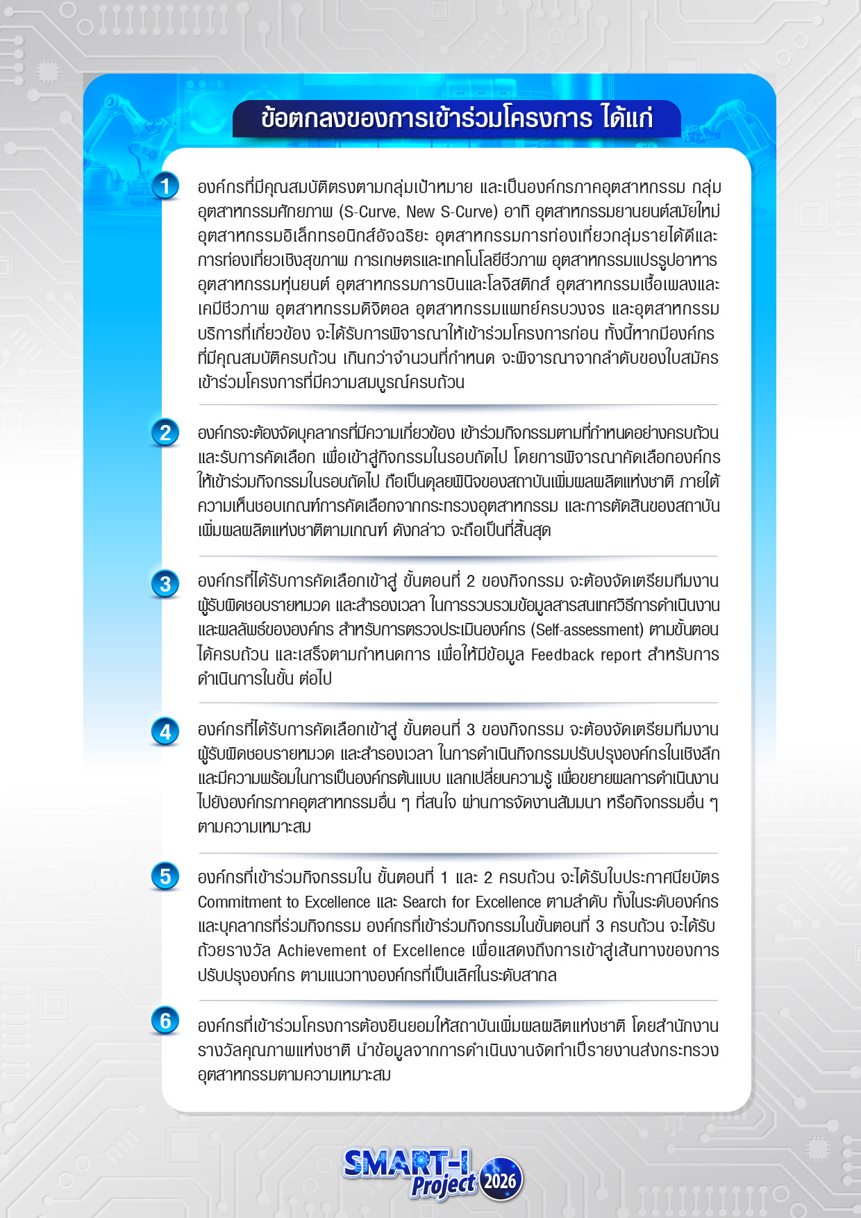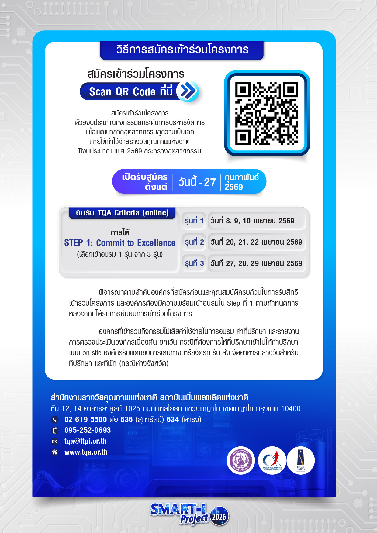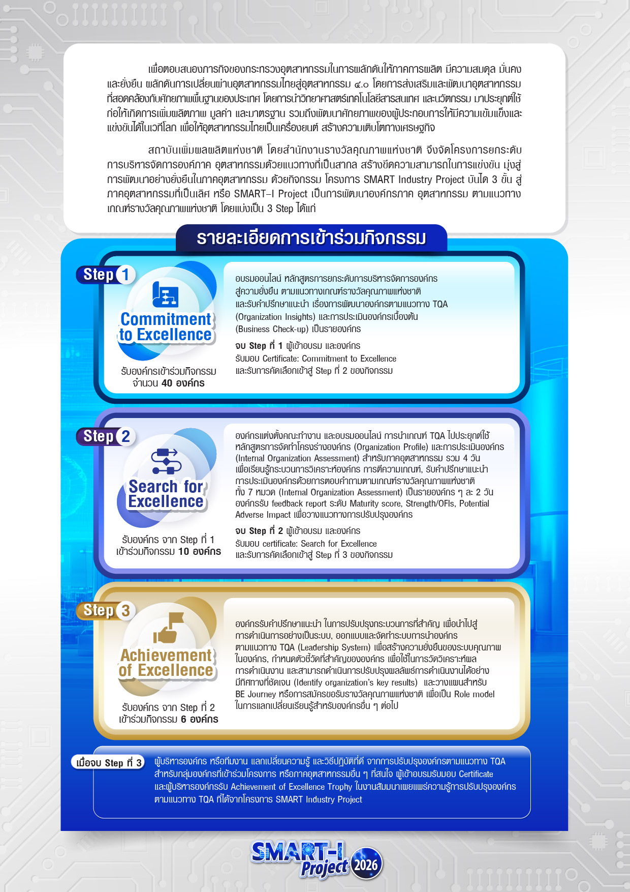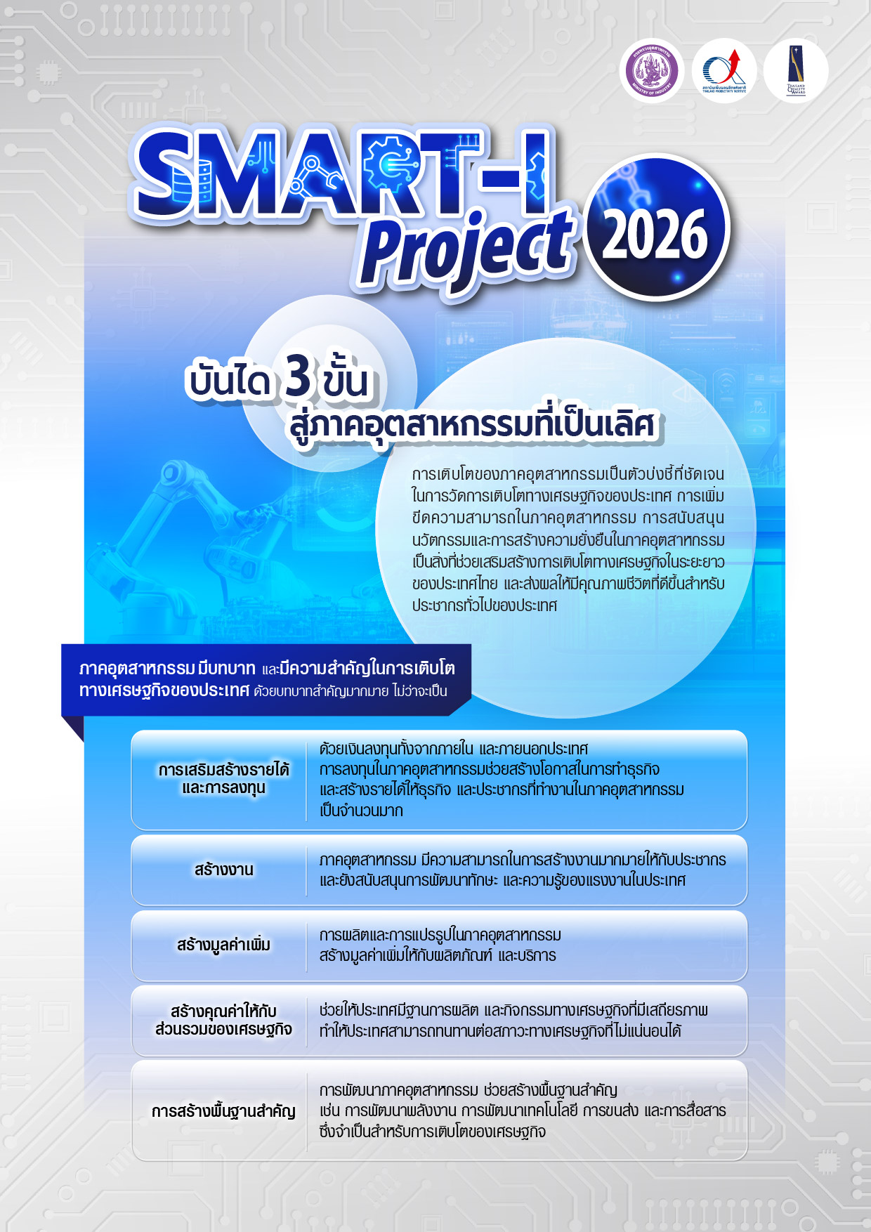 Smart Industry 2026 | บันได 3 ขั้น สู่ภาคอุตสาหกรรมที่เป็นเลิศ (ไม่มีค่าใช้จ่าย) 📅 เปิดรับสมัครวันนี้ ถึง 27 กุมภาพันธ์ 2569 🧾ดาวน์โหลดรายละเอียดโครงการ ใบสมัครเข้าร่วมโครงการ 👉 สำหรับบุคลากรในสังกัดสำนักงานอุตสาหกรรมจังหวัด และส่วนราชการในกระทรวงอุตสาหกรรม 👉 สำหรับองค์กรในภาคอุตสาหกรรม และบริการที่เกี่ยวข้อง Facebook Twitter Google+ Pinterest LinkedIn วันที่: 30 January 2026 เวลา: 11:36 น. หมวด: Learning Path