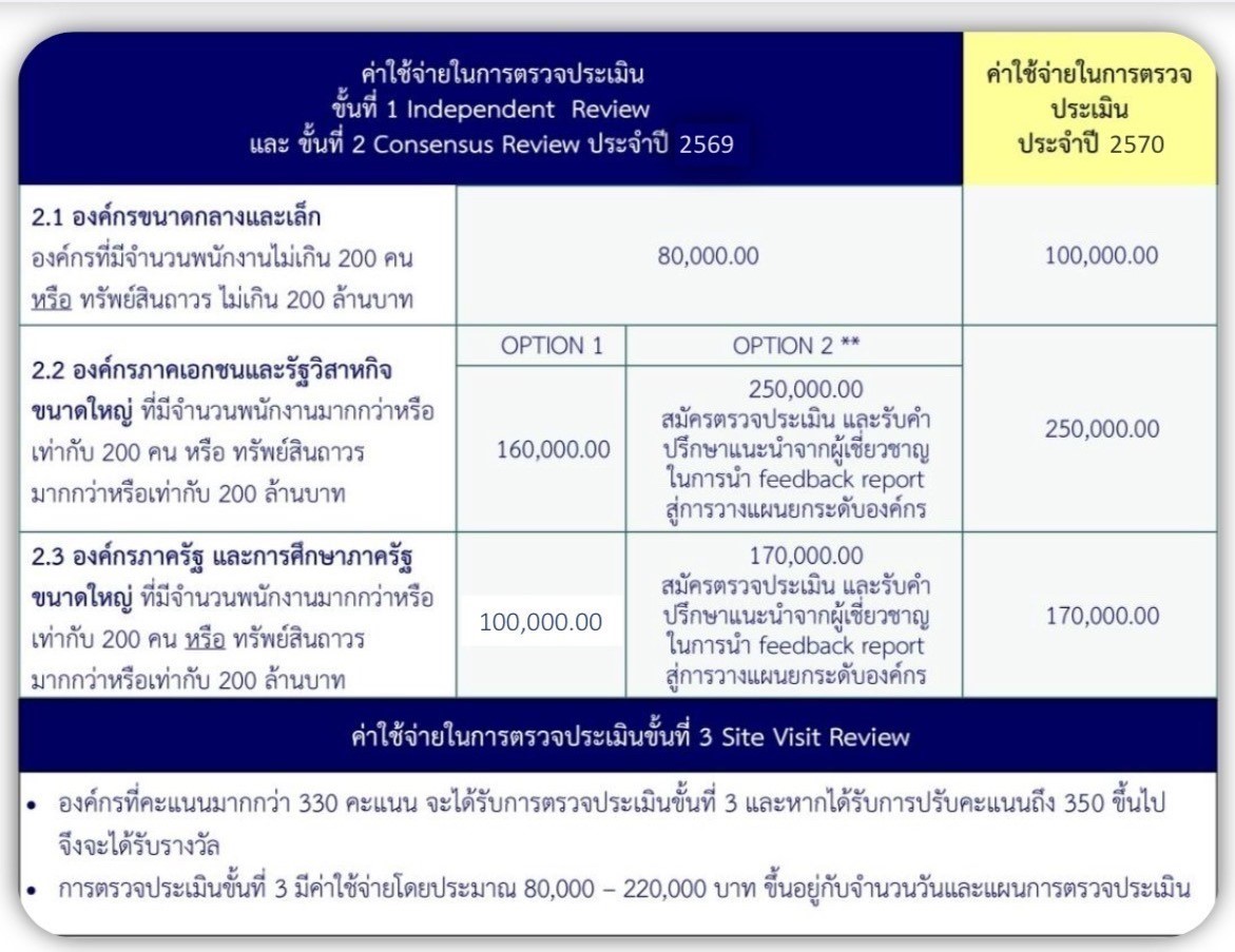- สำนักงานรางวัลคุณภาพแห่งชาติสงวนสิทธิ์ในการปรับเปลี่ยนค่าธรรมเนียมได้ในภายหลัง และค่าธรรมเนียมในการตรวจประเมิน